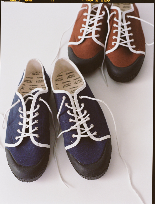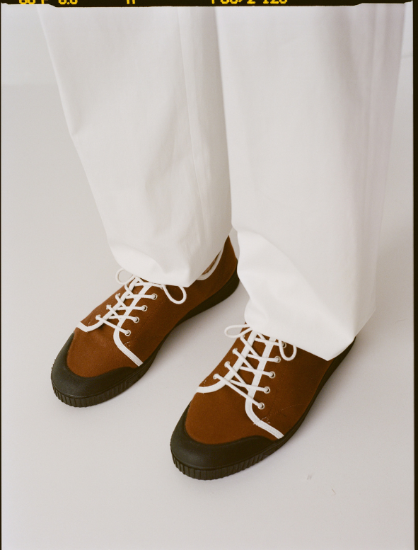 この2色は、ミリタリーシューズを想起させるブラックのラバーソールと呼応し、力強く洗練された印象を与えます。