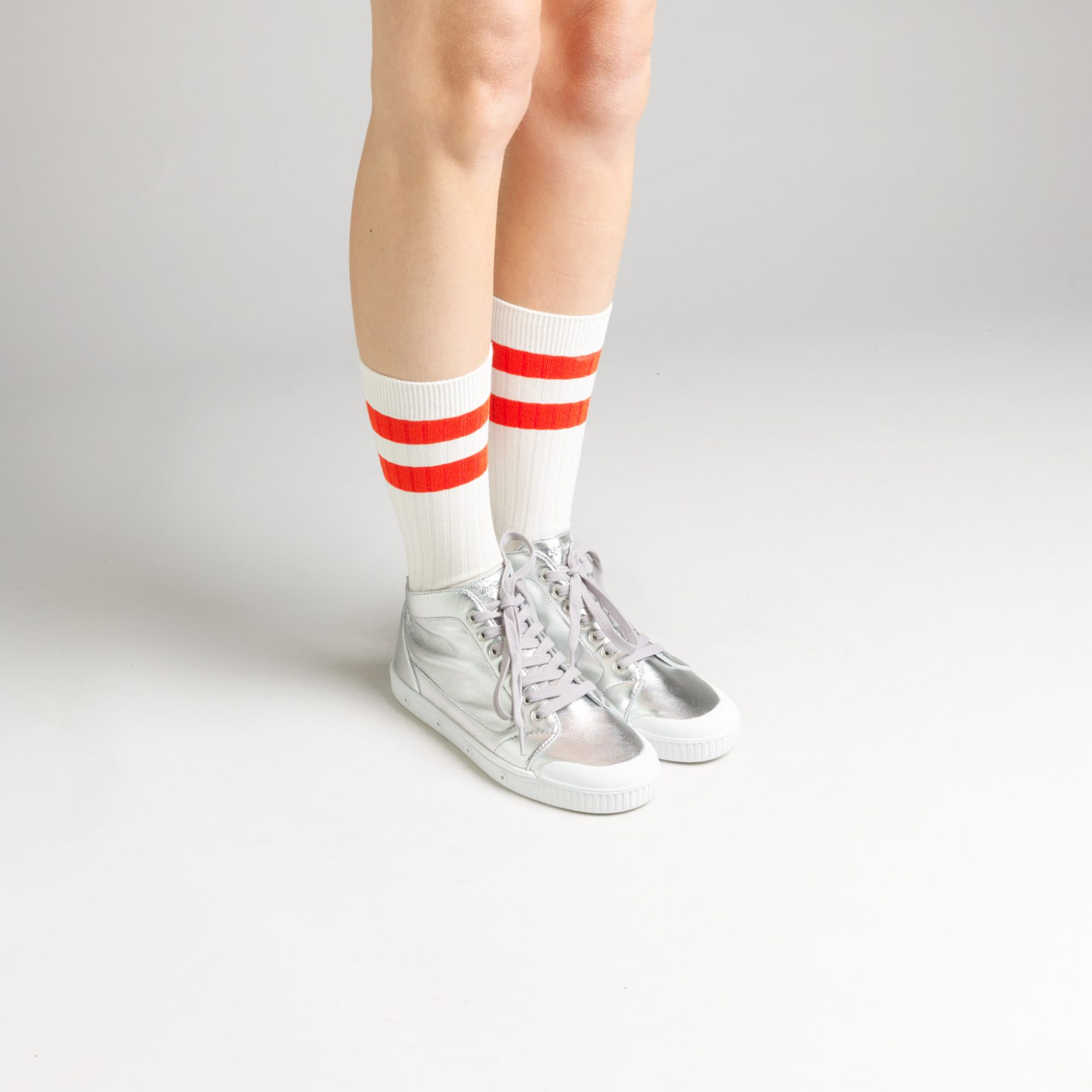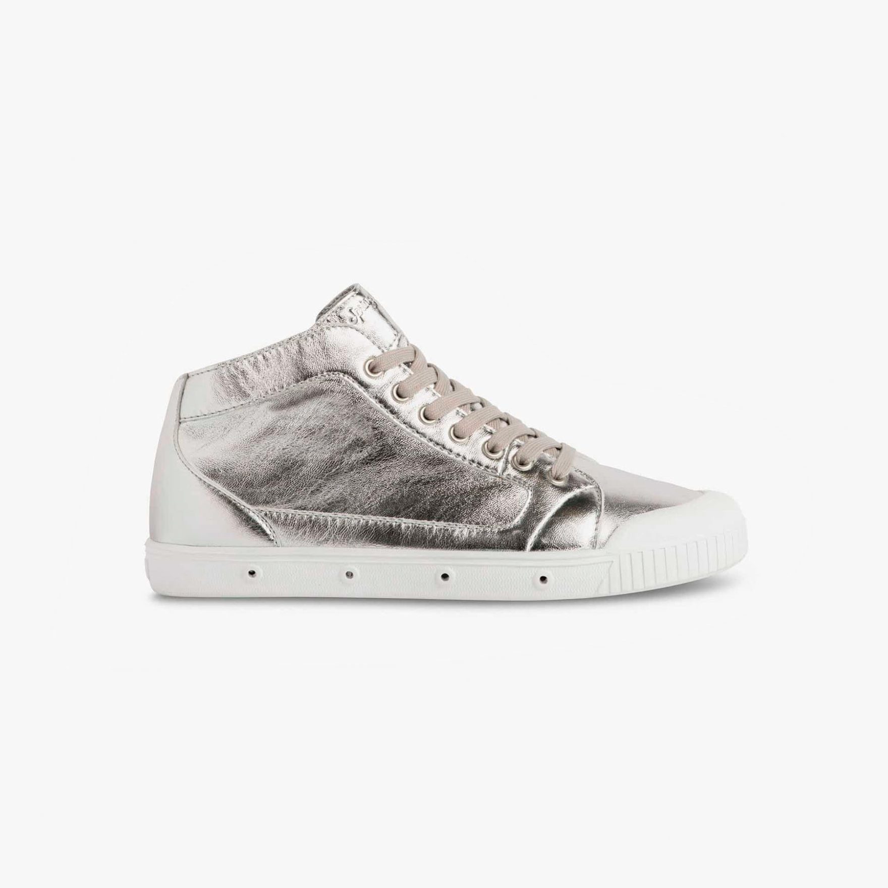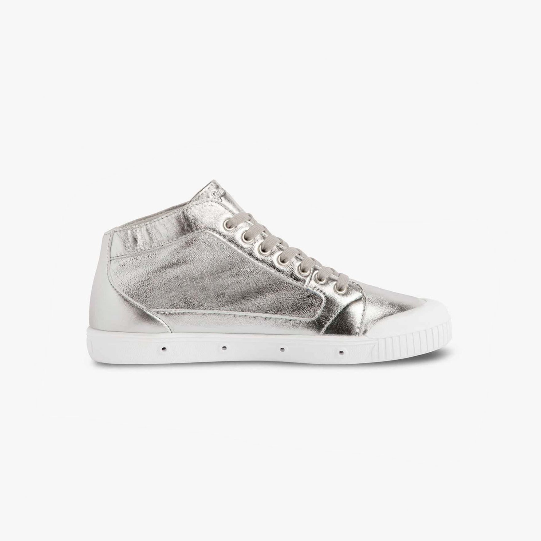 ハイカット アッパー:ラムスキン(シルバー) ライニング:なし シューレース:コットン(平型、グレー)、アイレット:7ホール アウトソール:ゴム底(ナチュラルカラー)、ミッドソール:ゴム底(ホワイト) 取り外し可能なインソール:ポリウレタン、コットン(表面) 空気穴が配されたラバーソール [特許取得] ベトナム製